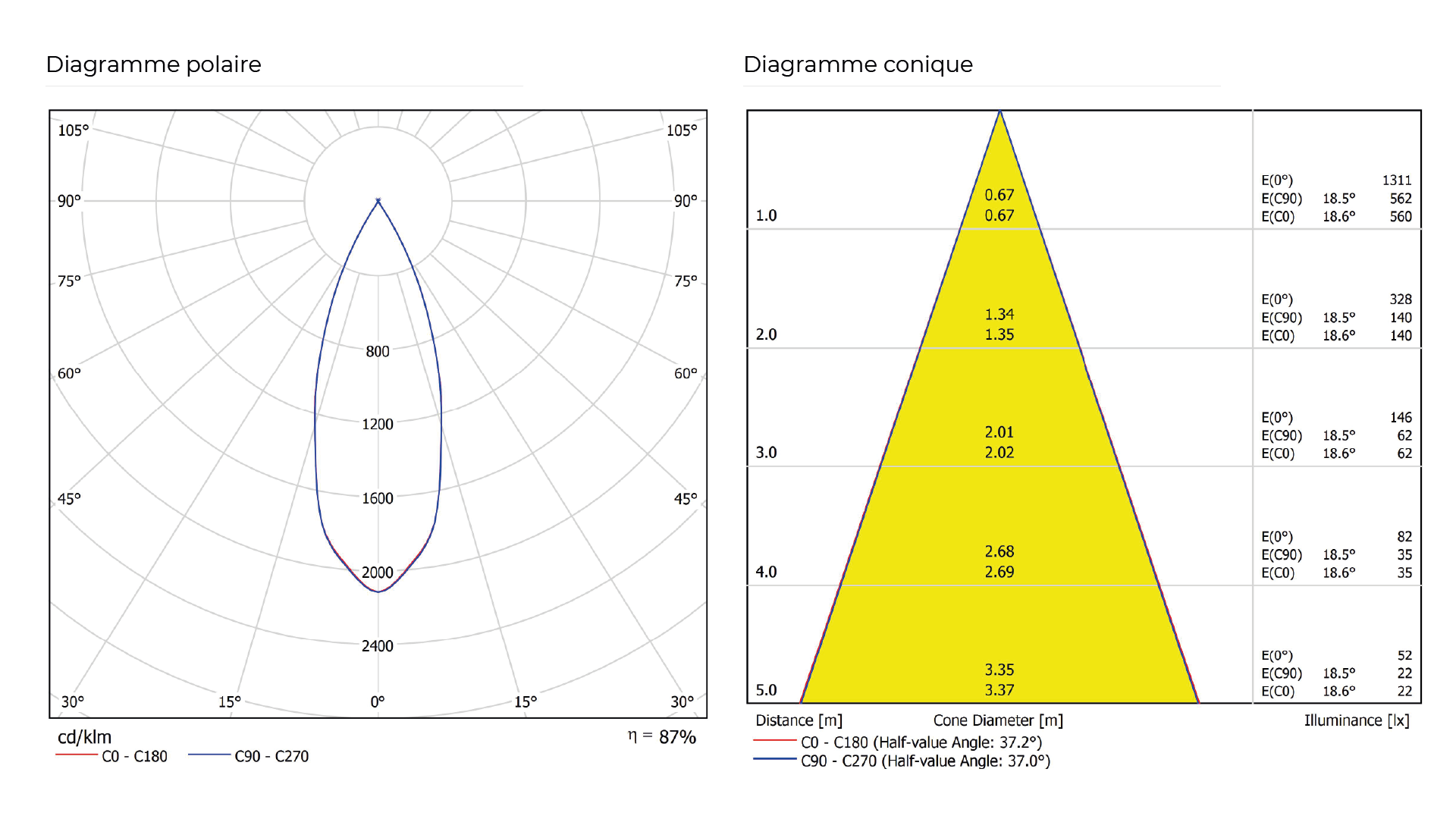 - Flux lumineux : 2700 K - 620 lm / 3000 K - 640 lm / 3500 K - 660 lm / 4000 K - 680 lm