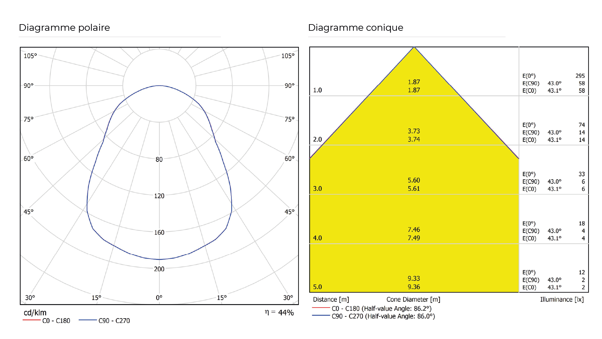- Faible éblouissement grâce à un angle de faisceau large de 86°, confort visuel assuré.