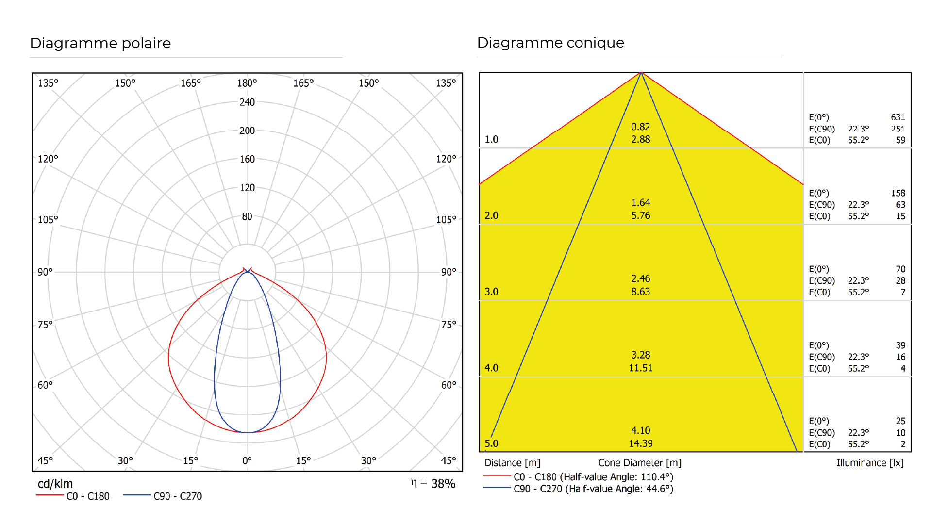 - Performance LED : flux lumineux élevé, bon rendement, qualité chromatique (CRI > 90).