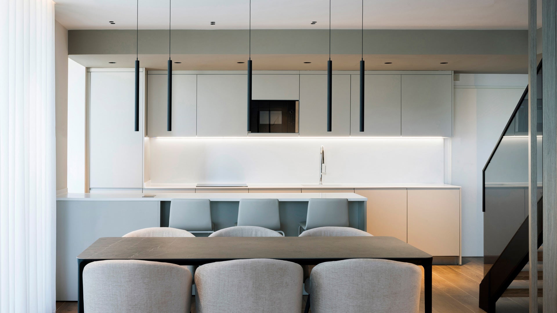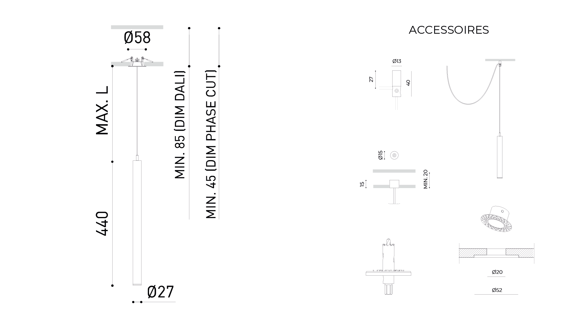 - Profil vertical pur et minimaliste : la fine suspension de 44 cm s’intègre sans surcharge visuelle.